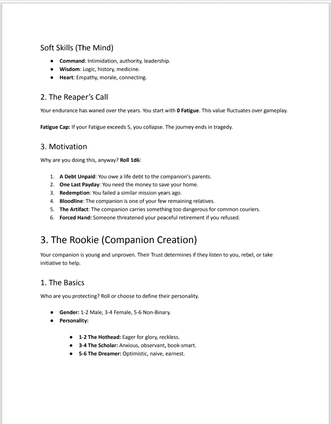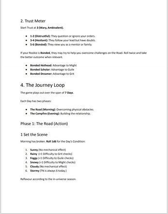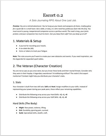 Escort (v0.2) is a journaling game about a hero past their prime on their final adventure. You can use the rules as a framework for a more freeform narrative, or simply play out your journey in bullet points. You'll only need a 6-sided die and notebook.